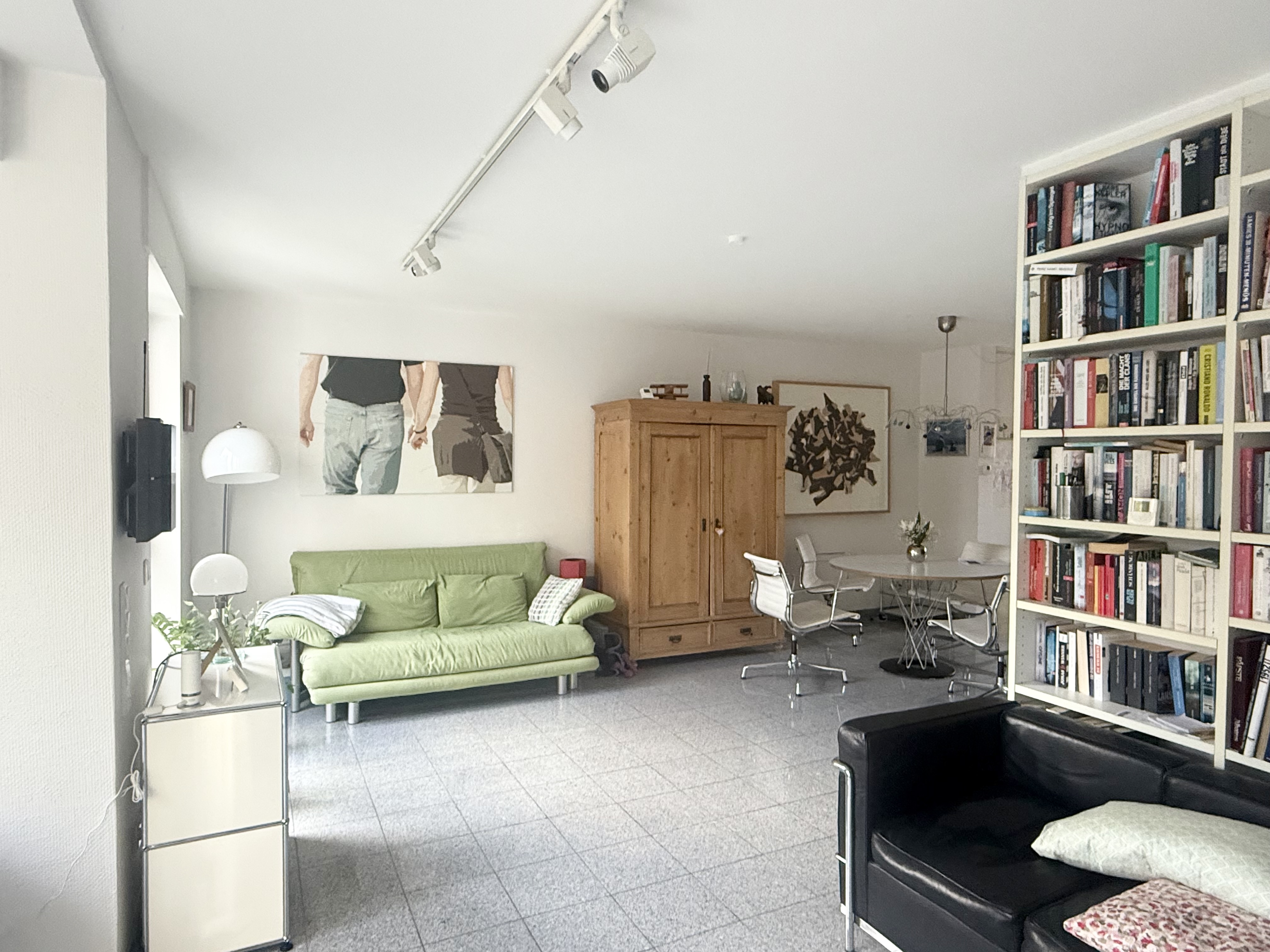 Vom Wohnbereich führt eine Wendeltreppe – die derzeit durch eine Leichtbauwand abgetrennt ist – in das 1. Obergeschoss, wo sich aktuell ein Büro befindet. Dieses kann bei Bedarf wieder mit der Wohnung im 1. Obergeschoss verbunden werden. Alternativ besteht die Möglichkeit, das Erdgeschoss und das 1. Obergeschoss zu einer großzügigen Wohneinheit zusammenzuführen.