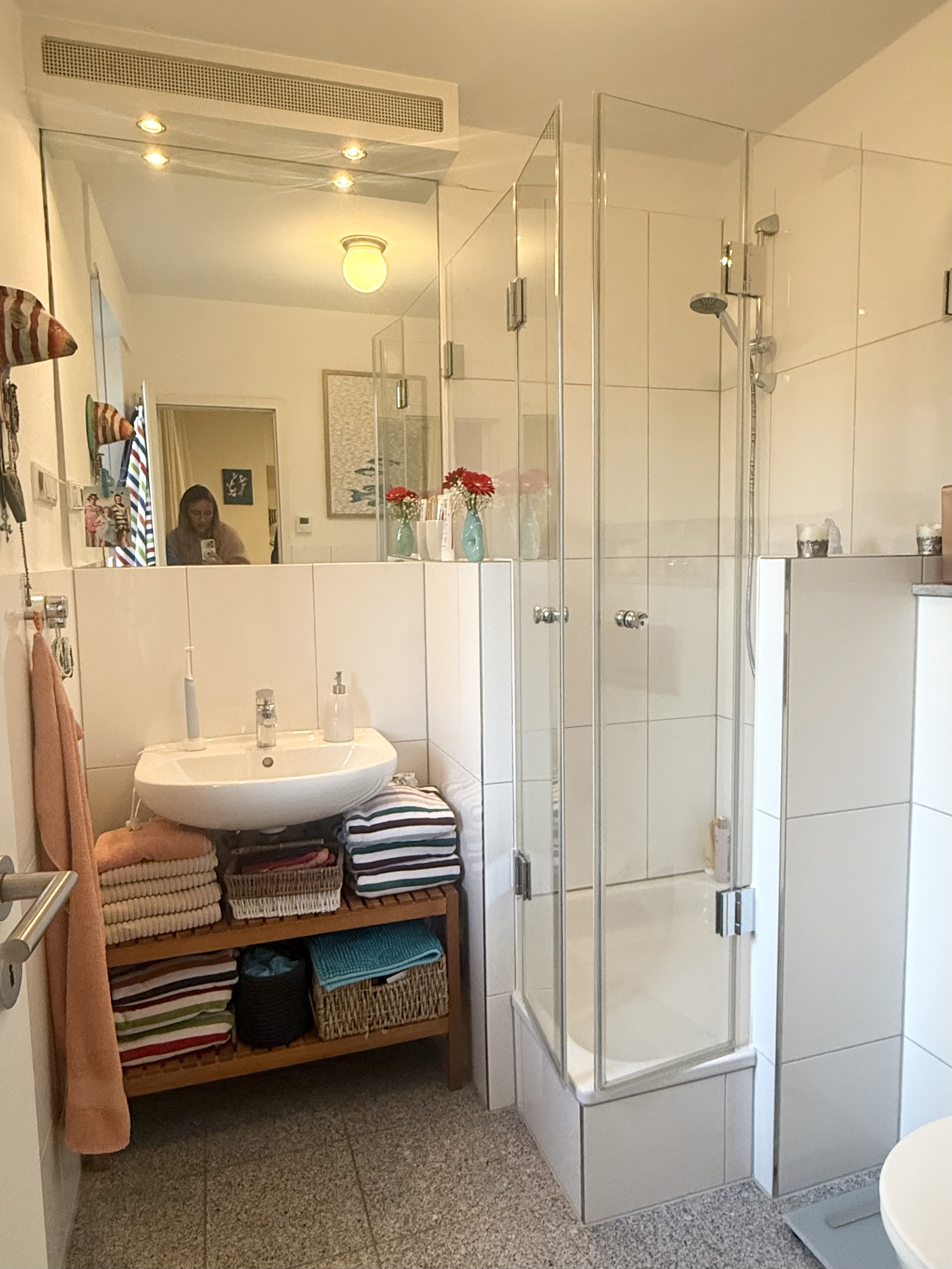 Die Wohnung im 1. Obergeschoss ist aktuell für 990€ brutto (ca. 700 € netto) möbliert vermietet und verfügt über zwei Zimmer, eine große Wohnküche, 2 Badezimmer mit Badewanne und Dusche sowie einen Balkon.